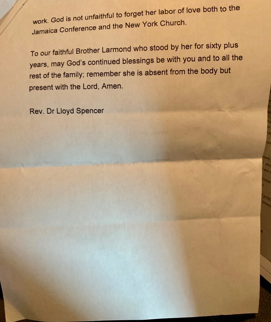 Rev. Larmond you have served the Lord well. Your race has ended, and your reward awaits you in heaven. 2 Timothy 4:6-8 (NKJV) applies to you, “For I am already being poured out as a drink offering, and the time of my departure is at hand. I have fought the good fight, I have finished the race, I have kept the faith. Finally, there is laid up for me the crown of righteousness, which the Lord, the righteous Judge, will give to me on that Day, and not to me only but also to all who have loved His appearing.” I salute you today! You have earned your place as a great woman of God. Your labor of love echoes across generations. As Matthew 25:23 (KJV) said, “Well done, good and faithful servant; thou hast been faithful over a few things, I will make thee ruler over many things: enter thou into the joy of thy lord.”