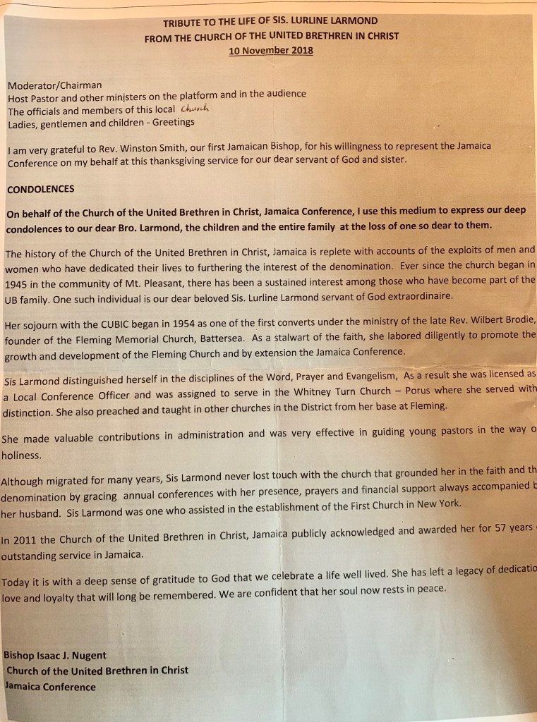 We set aside time to celebrate the life of an extraordinary woman of God, Rev. Lurline Larmond. This giant in the Christian faith has tremendously impacted my life and ministry. Her timely and profound counsel has helped shaped my pastoral ministry. Rev. Larmond has influenced my life from a boy to today. Her legacy will live on in the future. Rev. Larmond has touched every stage of my life since the age of 7 years old. During my late teenage years and as a young adult, I witnessed, intimately, her being the stabilizing person in the birth of First UB Church. During those early days, she allowed me many opportunities to preach and teach the word of God in this new church. She demonstrated her love for God, the church and her family. Her deepest desire is to see the church grow through conversions. I dearly love and honor this mighty woman of God.